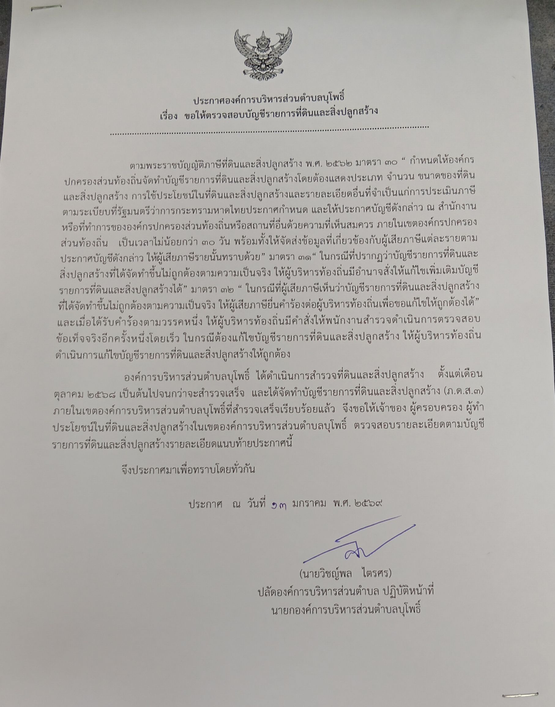 ประกาศขอให้ตรวจสอบรายการที่ดินและสิ่งปลูกสร้าง ประจำปีงบประมาณ 2569 |